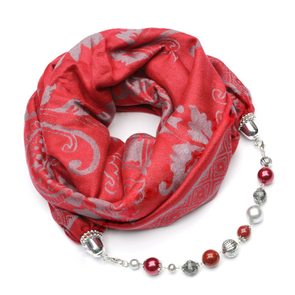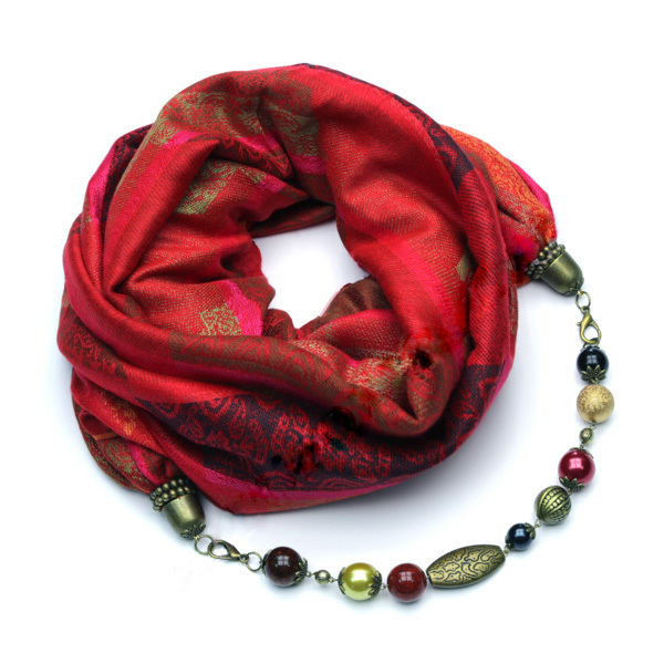 № 102 Кашемировый шарф с бусами: красный с золотым