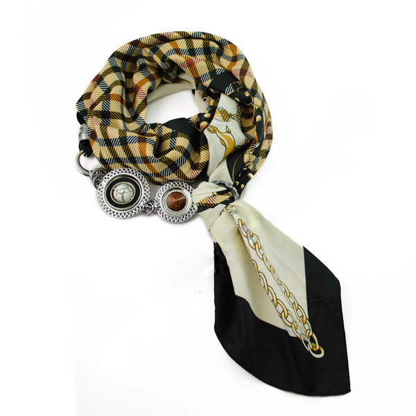№ 710. Шелковый шарф с украшением: белый в бежевую клетку