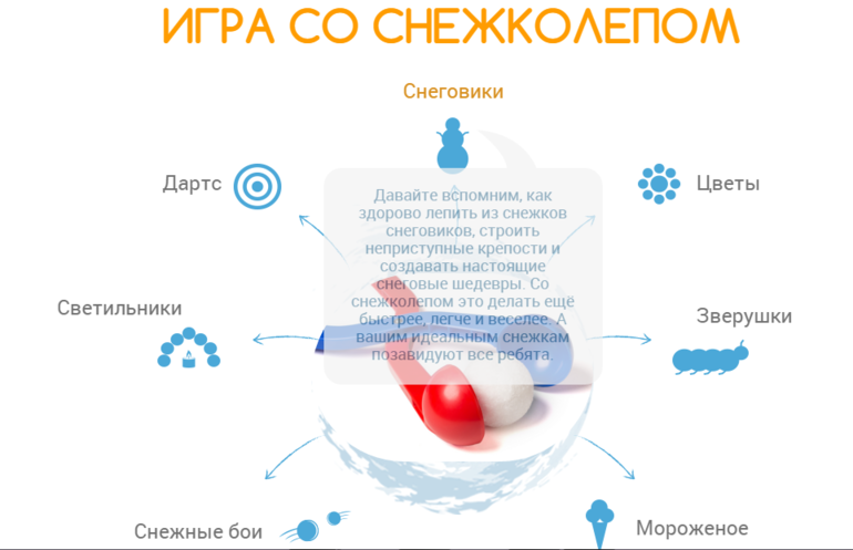 Со снежколепом каждый день может превратиться в праздник! С ним можно устраивать бои и соревнования, играть с детьми и преподносить сюрпризы. Снежколеп - универсальный подарок на Новый год и Рождество друзьям и близким, племянникам,отличный коллективный подарок детям в садах и школах!