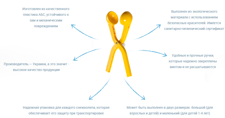 Размеры стандартного снежколепа-длина: 37 см, диаметр получаемого снежка: 7 см, вес: 195 гр..