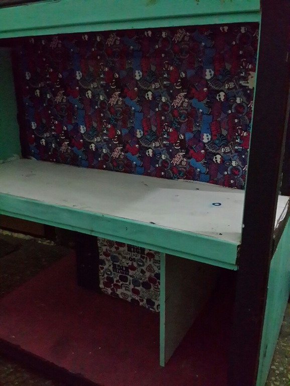 Дом весь из дерева. Внутри поклеены обои из бумаги с рисунком по теме. Можно перекрасить самим и дополнить как хотите.