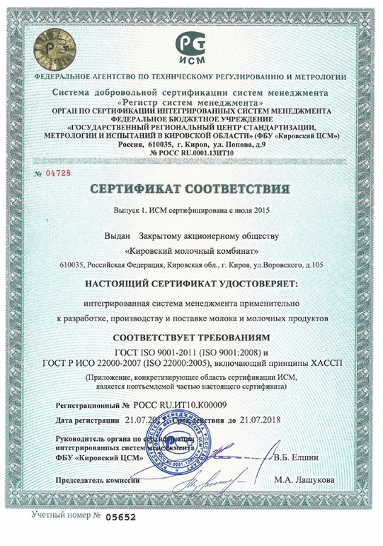Продукты«Кировский молочный комбинат - это высокотехнологичное предприятие, оснащенное современным оборудованием. Свои фермы обеспечивают комбинат молоком высшего сорта.Широкий ассортимент молочной продукции вырабатывается из натурального коровьего молока, без применения заменителей молочного жира, искусственных консервантов и интенсивных технологий.