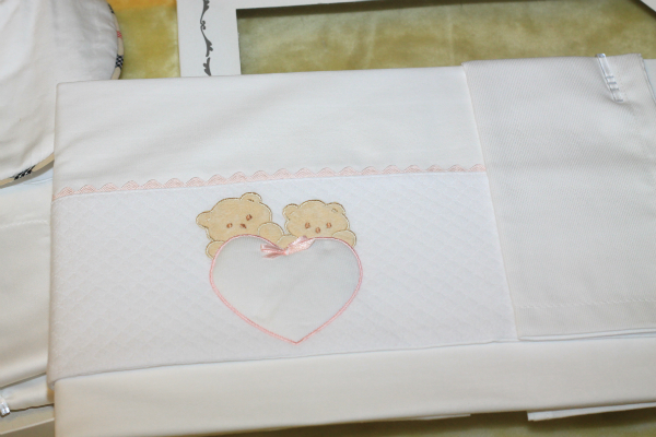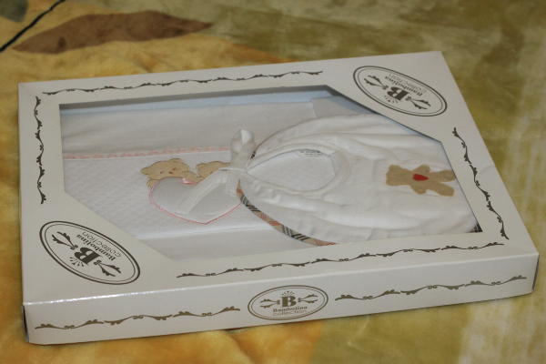 Во втором комплекте: простыня на резинке, наволочка, тонкое одеяло и слюнявчик.
