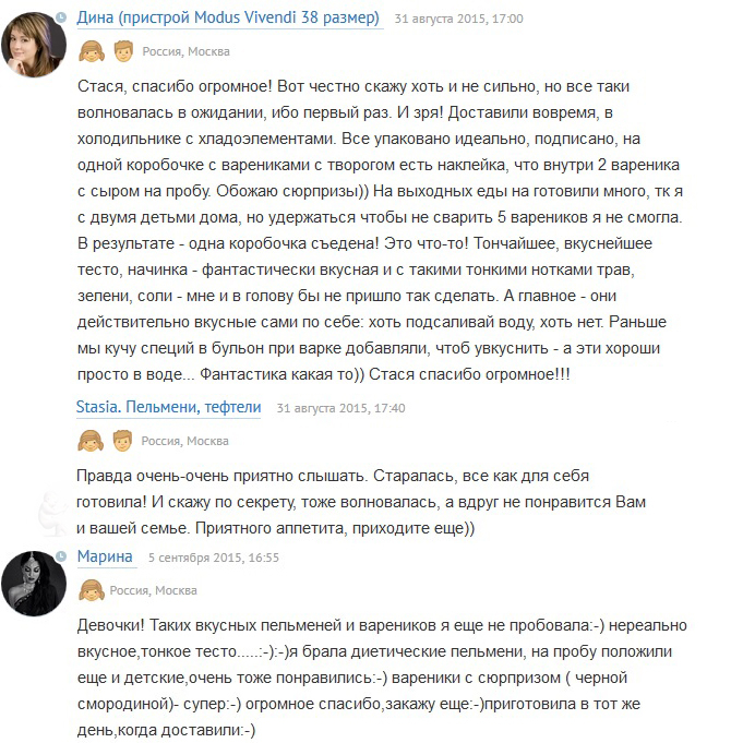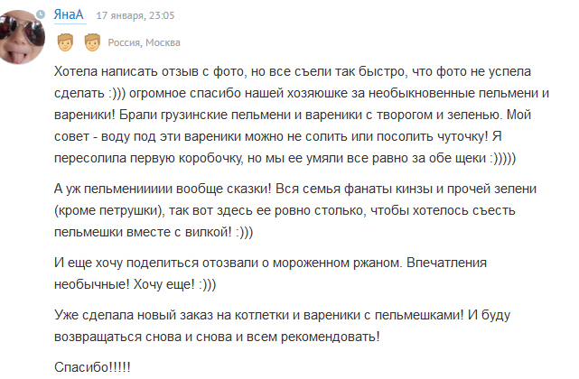 Пельмени и вареники на любой вкус, их у меня более 28 видов. Работаю не первый год, есть множество отзывов от моих благодарных и любимых заказчиков. Вот малая толика: