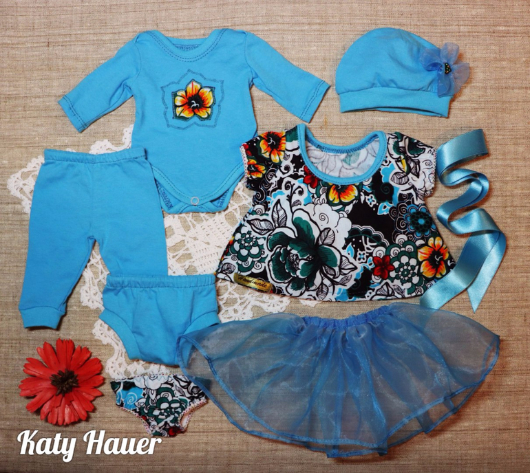 Большой комплект "Лагуна" 1200 р. Платье. брюки, трусики 2 шт, юбка, ленточка, шапка, боди. Хб трикотаж, органза, атлас, бисер.