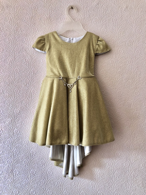 Первое платье на выход, как у принцессы, золотое с маленькими блестками, очень красивое. Цена 999