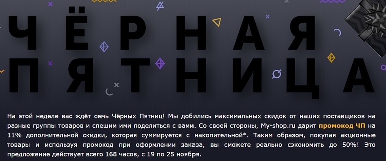 Черная пятница в МАЙШОП - новый промокод 11% и большие скидки