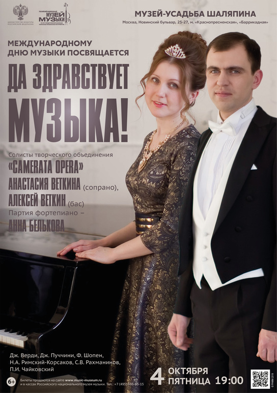 "Настоящий праздник ждёт всех гостей усадьбы Шаляпина на концерте, приуроченном к Международному дню музыки. В программе вокальные и фортепианные шедевры: арии из опер Дж. Верди, Дж. Пуччини, Н.А. Римского-Корсакова; романсы С.В. Рахманинова и П.И. Чайковского; ноктюрны и мазурки Ф. Шопена. Исполнители: лауреаты международных конкурсов Алексей Веткин (бас) и Анастасия Веткина (сопрано). Дуэт реализовал множество совместных творческих проектов, в том числе записал сольный диск «La Forza del Destino».