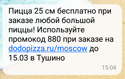 Для новых пользователей Додо-пицца скидка 100 рублей на доставку http://dodopizza.ru/Referrer/DD57B3898F6EC