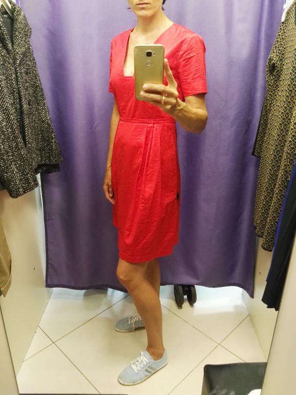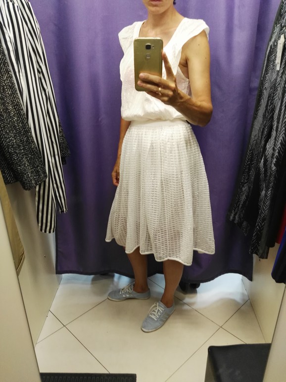 цены разные-платья 1999, ходила бы на работу-темное б взяла непременно... пальто-3999, но, блин, сколько их для счастья надо? Серые брюки 1300, шелковые в полоску-тоже, вроде великоваты. Белая юбка 1500, лен и хлопок. На самом деле она состоит из абсолютно автономного подъюбника и самой юбки. Персиковая блуза -90% шелк, 1400. Белая удлиненная-линдберг, 30% шелк, 70%-хлопок, но мнушка страшная... и еще одно пальто произвело на меня впечатление- мейд ин франс, фирму не знаю, качество отличное, но не для меня точно
