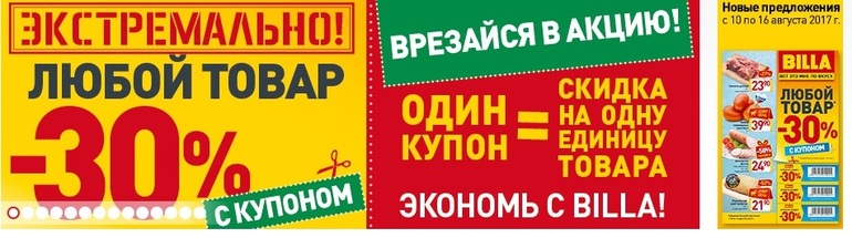 Билла - 30% скидки на любой товар с купоном до 23 августа