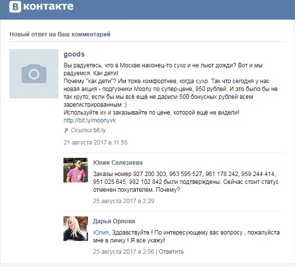 Интернет-магазиныНаписала на страничку Goods в Контакте. Какая-то Дарья Орлова написала, что все вопросы в личку. И вот, что я получаю в ответ