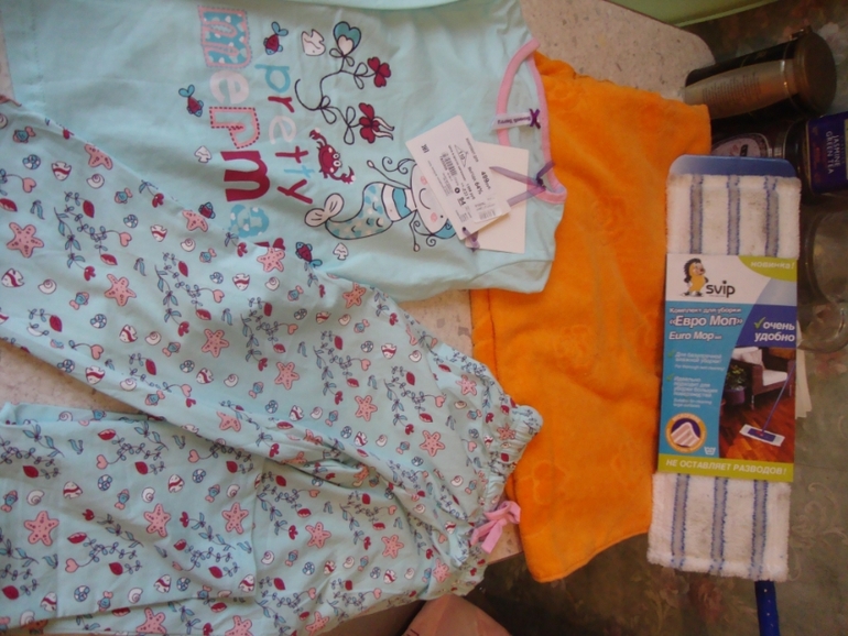 и 3 чек: пижама sweet Berry р.110 очень приятная за 499руб. =0руб., швабра Svip за 599руб (как у Марии не было, у этой понравилась насадка: где голубое материал погрубее, даже сухая собирает хорошо пыль - дочка уже прошлась