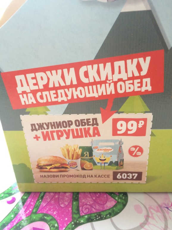 Продукты питанияАкция на детское меню с игрушкой (смурфики,маленькие барби или машинки хот вилз), если назвать код 6037 за 99р. А если еще заплатить картой сбербанка, то 40% вернутся бонусами спасибо (мне тут же зачислили). До какого числа не помню, но вроде не долго еще.