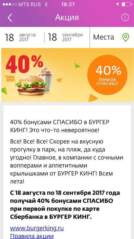 P.S. Почитала правила. 40% только на первую покупку в бургеркинг по карте сбера