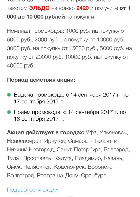 Ха))) Повторюшки))) Но я тоже за конкуренцию. Тем более, что у Эльдорадо больше ассортимент товаров. Пойду почитаю условия акции