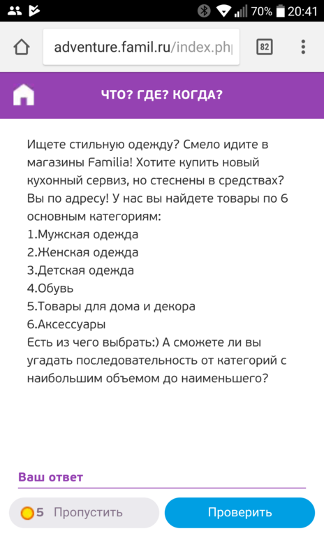 Марина в Выбор товаров и услуг для дома и семьи 8 лет Какой ответ? Болталка Пробовала 2 раза , говорит нет, еще раз Посмотрите еще 20 записей на эту тему Отменить Ответить Юлия Тоже устала мучиться 24.10.2017 Ответить Марина Я еще как то не так вводила, зарятая пробелл.. Просто цифры вставила и ок 24.10.2017 Ответить Танечка 215436 24.10.2017 Ответить Марина Спас ибо! 24.10.2017 Ответить Такси. Фамилия квест Чаты Беременных Выберите чат: Январята-2026 Февралята-2026 Мартята-2026 Апрелята-2026 Майчата-2026 Июнята-2026 Июлята-2026 Августята-2026