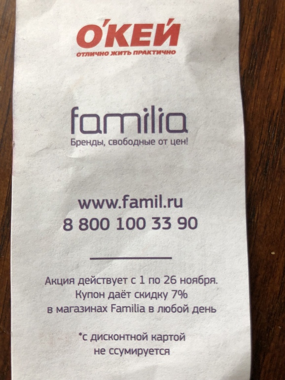 Сегодня в кожухово в окее при покупке выдают купон на 7% скидку в фамилию