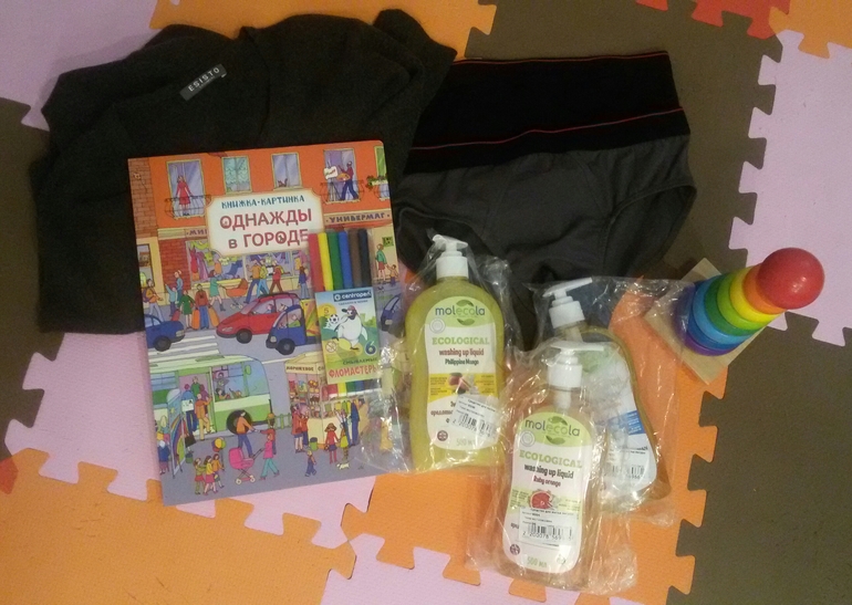 Труселя для мужа за 100 рублей, пирамидка Melissa&Doug за 50, три бутылки средства для мытья посуды за 30, книжка-гляделка и набор фломастеров - бесплатно))) кашемировый свитер за 650. Огромное спасибо Марии и сообществу!