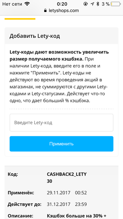 Вот прям в лк внизу есть лети коды и там выбираете , попала я вас обманула именно на 30 % на гудса сейчас не действует потому что у него сейчас и так повышенный кэш , действует на все где нет доп акций
