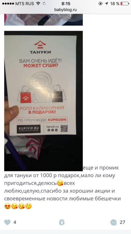 Сейчас заказала с этим промокодом, курьер привез суши и начал купон неистово требовать. Пришлось звонить в тануки уточнять, в итоге сказали, что можно без купона, раз промокод введен при заказе. Но курьер напряг и настроение подпортил(