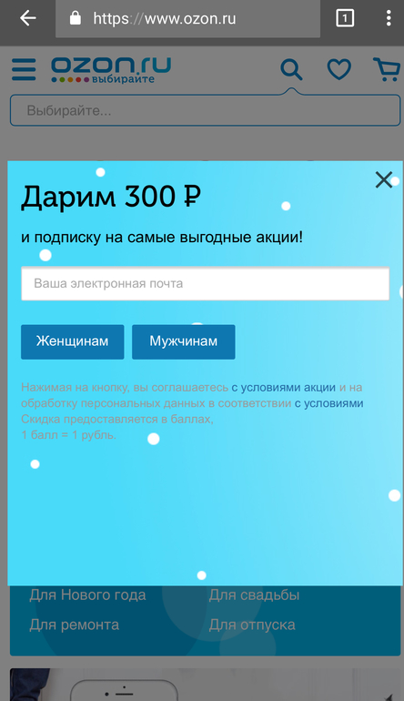 Снова выскакивает баннер. 300 от 1500 за подписку (предварительно, само собой, не забудьте отписаться от рассылок, в личном кабинете).