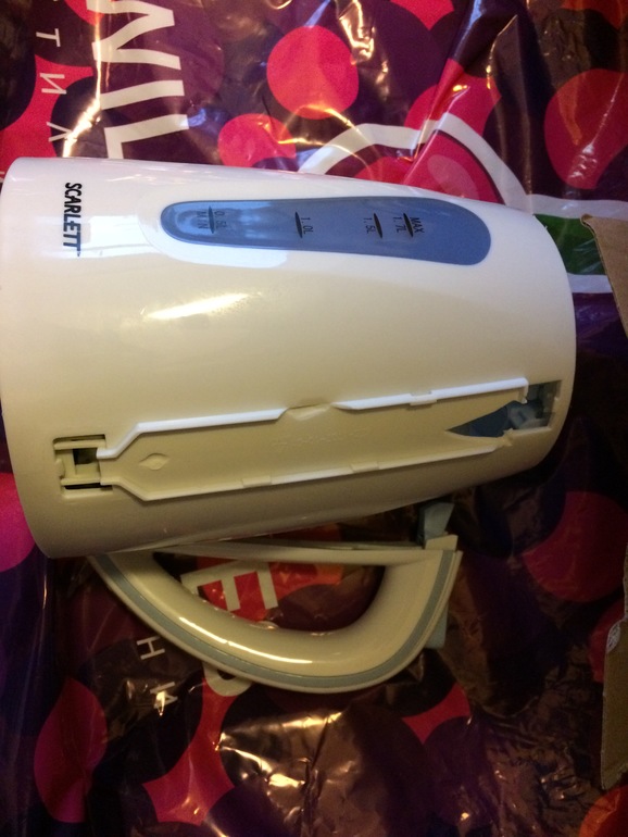 Точнее почему то он мне на телефоне стал по,,казывать, что я заказала.когда курьер ушёл пошла на кухню, открыла , а там чайник без подставки и шнура, ручка отломана..гарантии нет, коробка разорвана .сразу ему перезвонила, а он не берет трубку . С телефона мужа трубку взял и говорит, вернуться на могу потому как очень спешит..звоните в колл центр. В коллцентре сказала,