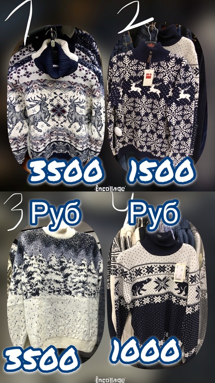 Первый нравитсяс больше всего но второй не сильно отличается а стоит на 2000 дешевле. На эти деньги1 можно что-то ещё купить. Брксеры например. Свитер 3 оригинальный но слишком утонченный для мужа. 4й с мишками а я люблю оленей больше зато он по цветовой гамме такой же как и первый но дешевле в три раза.