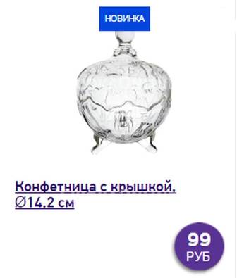 Летом в фиксе взяла конфетницу, очень нравится мне, но вот хотела взять на дачу такую же, не смогла найти. В общем, советую. Конфет влезает много, выглядит не на 99р точно.