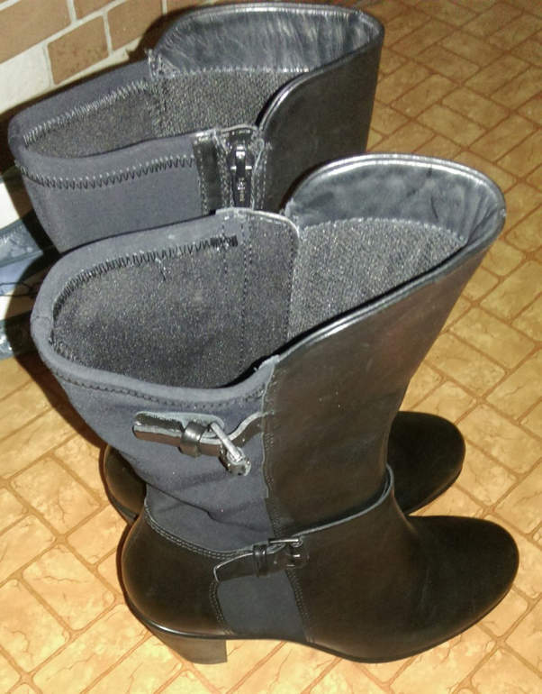 Сапоги Экко вообще кто-то для себя спрятал в дальний угол вглубь полки:-) Случайно их там обнаружила. За счет текстильной вставки сзади хорошо сидят по ноге, не собираются в складки и не топорщатся.