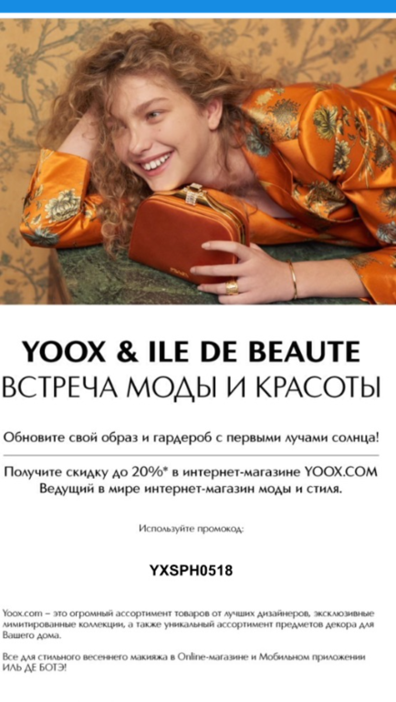 Промокод YXSPH0518 предоставляет скидку 15% на сайте yoox.com/ru/ и скидку 20% в Мобильном приложении YOOX при покупке на сумму от 10 000 рублей в период с 20 мая по 02 июня 2018 года, включительно. Для того что бы воспользоваться промокодом перейдите на сайт yoox.com/ru/ по ссылке размещенной в разделе Партнеры