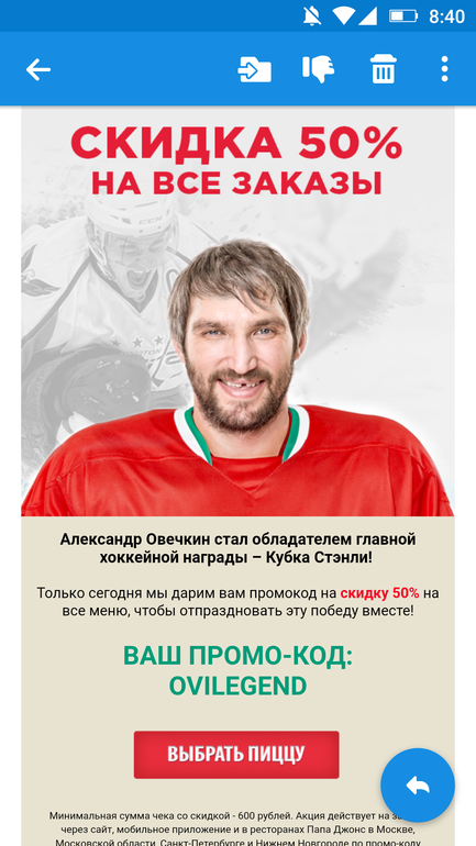 Вера в Выбор товаров и услуг для дома и семьи 8 лет Папа Дж Промокоды, Баллы, Бонусы. Купоны на скидку От 600р со скидкой онлайн и оф в Москве, Питере, Н.Новгороде. Посмотрите еще 20 записей на эту тему Отменить Ответить Вера 08.06.2018 Ответить Ирина У кого-то получилось заказать? У меня не проходит промокод( 08.06.2018 Ответить Вера Я заказала, жду) 08.06.2018 Ответить Ирина Сейчас получилось,спасибо) 08.06.2018 Ответить Вера С приложения. А заказ на какую сумму? 08.06.2018 Ответить Вера 600 со скидкой, то бишь заказ от 1200. 08.06.2018 Ответить marucia171 Да 08.06.2018 Ответить Мария Круть 08.06.2018 Ответить Спортмастер, как увеличить баллы Скидка в ПапаДжонс 50% Чаты Беременных Выберите чат: Январята-2026 Февралята-2026 Мартята-2026 Апрелята-2026 Майчата-2026 Июнята-2026 Июлята-2026 Августята-2026