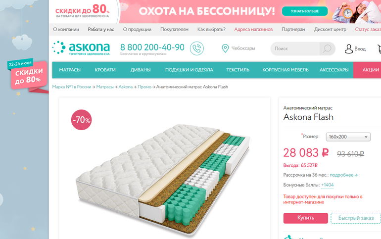При оформлении заказа на горячей линии этот матрас стоит 17 тысяч в размере 160*200. Есть другие модели матрасов, но скидка поменьше. Акция действует только в интернет-магазине. Съездила в салон, чтобы посмотреть вживую, но этой модели к сожалению не было и больше 15% не хотят делать скидку. Есть кое-какие акционные модели, но не с такой соблазнительной ценой. Кинг-Койл понравился, но цена больше 100 тыс.