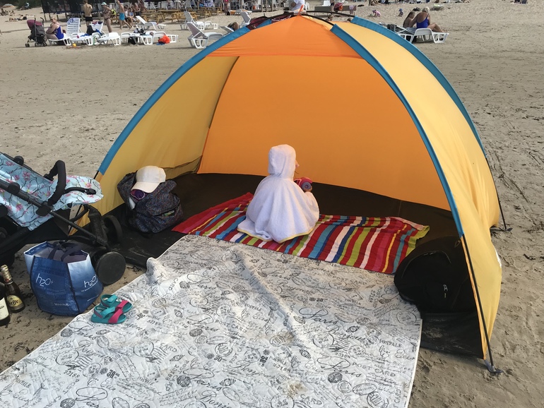 И мой отзыв скопирую из комментариев: Плюсы: свой тент, не надо платить за аренду, компактный, легкий. Внутрь в угол закидывали все "ценные" вещи (удобней следить и меньше шансов, что утащят) Тентом занимаешь достаточно места на пляже для семьи, вам никто "на голову" не уляжится. Мы еще перед тентом разбрасывали детские игрушки, маленький надувной бассейн и у нас было "забито" место для нас. Колышки можете не брать с собой, в рыхлом песке они не держат. Достаточно песка или гальки насыпать в спец. кармашки и тент прочно стоит.
