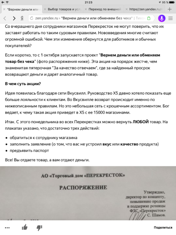 У нас в одном из перекрестков на кассе висели объявления, что если вам не понравился товар, то мы вернем деньги, даже без чека. Не обращала внимания висят ли еще. По факту, недавно возвращала товар без чека, муж покупал, чек выкинул, сумма приличная. Пришла, сказала, что чека нет. Сказали, что без чека все сложнее, уточнили когда покупали. В итоге восстановили наш же чек, по нему сделали возврат.