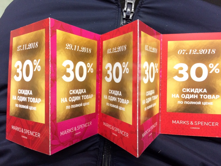После покупки дали купоны на скидку 30% в определенные дни на товары по полной цене: