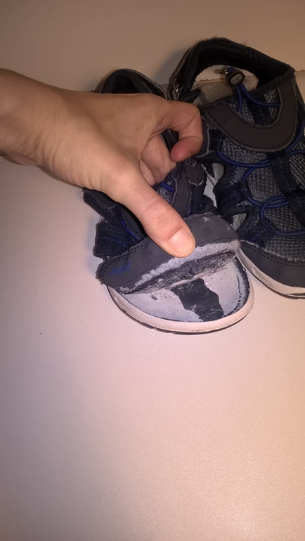 Куплены сандалии в сентябре на сменку, но носили их мало - по пол дня и болели, каникулы, кроссовки на замену. Отклеилась подошва, видно, что просто отвалилась без механического воздействия. Сандаль сразу был какой-то кривоватый, но надо ж срочно и уже оплачены-доставлены:(