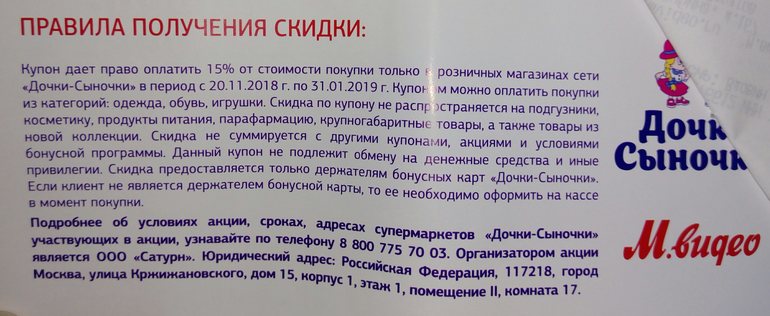 Но есть и скидка в Дочки-сыночки из М.Видео: 15% только в розничные магазины, действует по 31 января 2019 г.