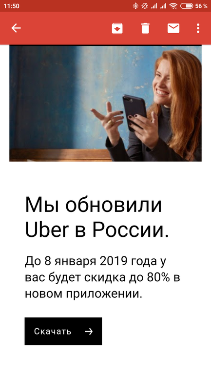 УслугиУбер прислал на почту письмо, правда никаких условий для скидки я не нашла. Новое приложение скачала, в плей маркете называется Uber Russia. В нем скидку тоже не увидела 🤷