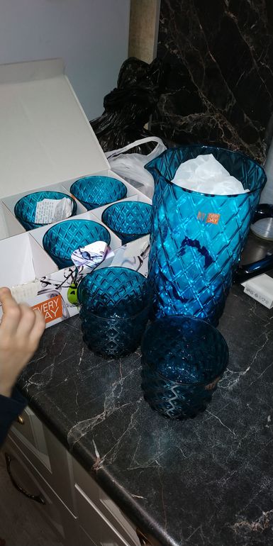 Был ещё такой же графин с уценкой, но чуть дороже моего, черный без уценки. Красные стаканы высокие низкие, бирюзовые низкие - без уценки
