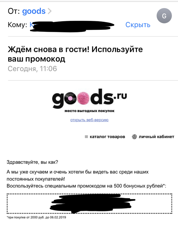 Ксюша в Выбор товаров и услуг для дома и семьи 7 лет Гудс, 500 от 2000. Проверяйте почту! Промокоды, Баллы, Бонусы. Купоны на скидку Я регулярно заказываю, поэтому надеюсь, рассылка массовая. До 06.02.19. Посмотрите еще 20 записей на эту тему Отменить Ответить Светлана Прислали сегодня )) 19.01.2019 Ответить Ксюша Ура! А то я даже расстроилась от комментов снизу, надеялась на щедрость Гудс 19.01.2019 Ответить Светлана Это видимо рассылка дла редкозаказывающих )) На другой акк, с которого больще заказов было, не прислали. 19.01.2019 Ответить Донна Роза пусто (((( 18.01.2019 Ответить Anna Nicole Как Вам повезло! Тоже хочу, но пусто(( 18.01.2019 Ответить Муся Ни на один из 3 аккаунтов не пришёл, хотя я заказываю 2-3 раза в неделю 18.01.2019 Ответить Маша Е У меня тишина... Хотя каждый месяц что-то у них заказываю 18.01.2019 Ответить Юла промик Хофф обмен купонами Чаты Беременных Выберите чат: Январята-2026 Февралята-2026 Мартята-2026 Апрелята-2026 Майчата-2026 Июнята-2026 Июлята-2026 Августята-2026