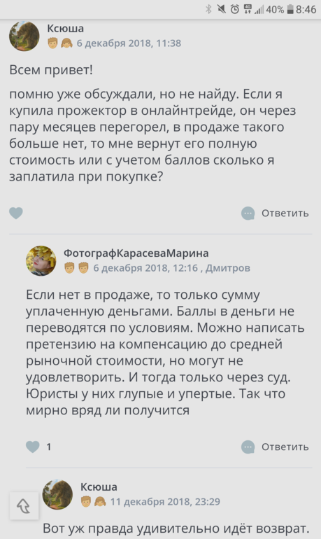 Возвращали планшет с полоской пикселей в онлайнтрейд, проблем не было, но ждали правда. Баллы возвращали списанные. Ну и были пару раз еще возвраты, например, конвектор с царапинами и вмятиной, вернули без проблем. Так что в онлайнтрей надо хотя бы внешне все сразу смотреть.