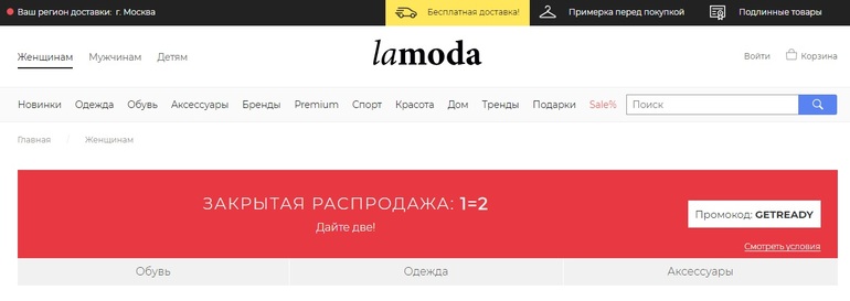 При любой сумме заказа. Промокод дает скидку в размере стоимости товара по наиболее низкой цене среди двух товаров акции. Скидка будет равномерно распределена между всеми товарами в заказе, участвующими в акции. В акции участвуют все товары, представленные на данной странице. Ассортимент товаров, участвующих в акции, может измениться. Дополнительная скидка по программе лояльности Lamoda Friends&Family не применяется совместно с промокодом данной акции. C 19 по 20 марта 2019 года включительно.