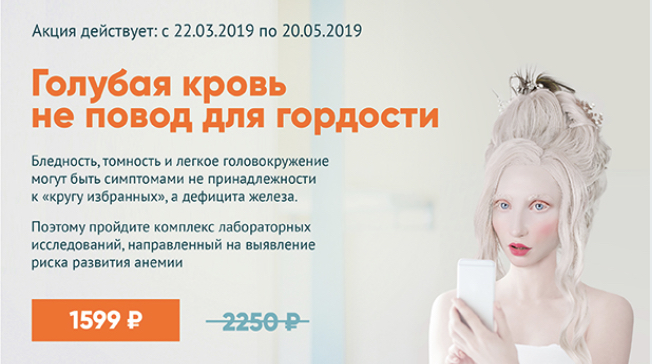С 22 марта по 20 мая 2019 года в офисах ИНВИТРО Москвы и Московской области проходит акция «Голубая кровь не повод для гордости». Вы можете заказать выполнение лабораторных исследований со скидкой за 1599 рублей (c)
