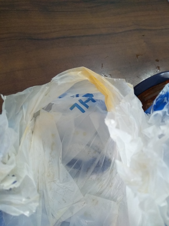Банка соуса в стеклянной банке в обычном пакете-маечке) Чудом не разбилась, просто крышка открылась и частично разлилось.