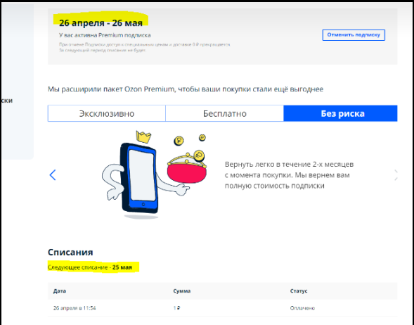 12 апреля подписалась,подписка на 30 дней,11 мая был 30 день подписки,но уже утром начали списывать деньги,хотя я хотела вечером отписаться ,но кнопка уже пропала,на карте не было денег,но каждый день все равно пытаются списать,мне пришлось заблокировать карту,написала письмо в поддержку 11 мая,чтобы отписали меня,но ни ответа ни привета,все равно пытаются списать,хотя премиум уже приостановлен в личном кабинете с 12 мая.У меня стояло напоминание в телефоне на 11 мая,как смотрю и у многих,но озон оказался как всегда хитрее,и на день раньше начал списывать у всех деньги.