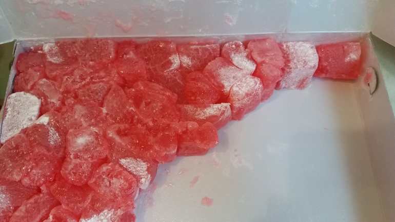 - розовый лукум просто слипся от жары, превратился в кашу, и на вкус и цвет одна химия