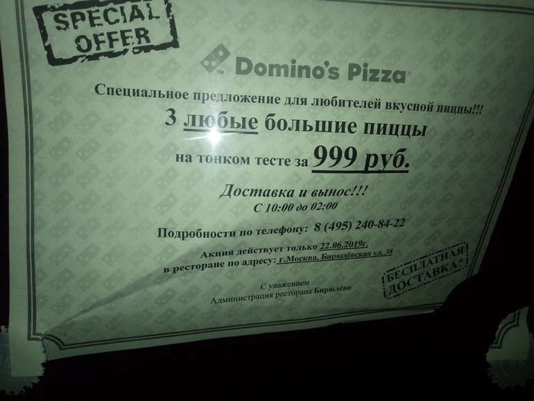 Эта рекламка на машине доставки доминосо, смотрите на машинки своего района, может и на них есть для ближайших такая акция. А эта от доминос на бирюлевской. И только 22.06.