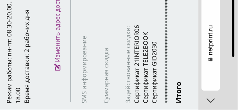 Скидки и акции (для всей семьи)Сейчас отправила в печать фотки, получилось достаточно выгодно: 2 пенокартона 20*30 за 200 р, фотокнига премиум в мягкой обложке на 8 разворотов бесплатно, холст премиум 650, доставка 250. Применённые промокоды на фото, на пенокартон действует сегодня до 12:00 !!!
