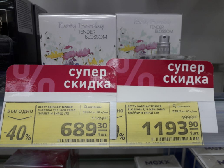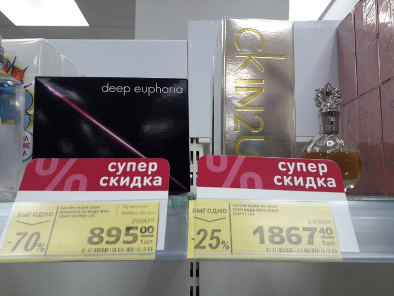 Я была в соседнем городе в гипермаркете, конкретно парфюм смотрела, там весь товар без скидок вообще. То есть еще и не во всех магазинах получается...